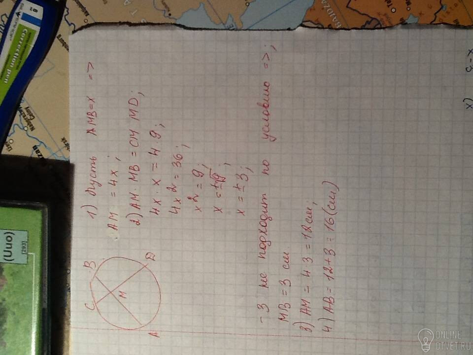 Хорды AB и CD пересекаются в точке M, найти длину хорды AB если CM 4 см, DM-9см, AM/MB=4