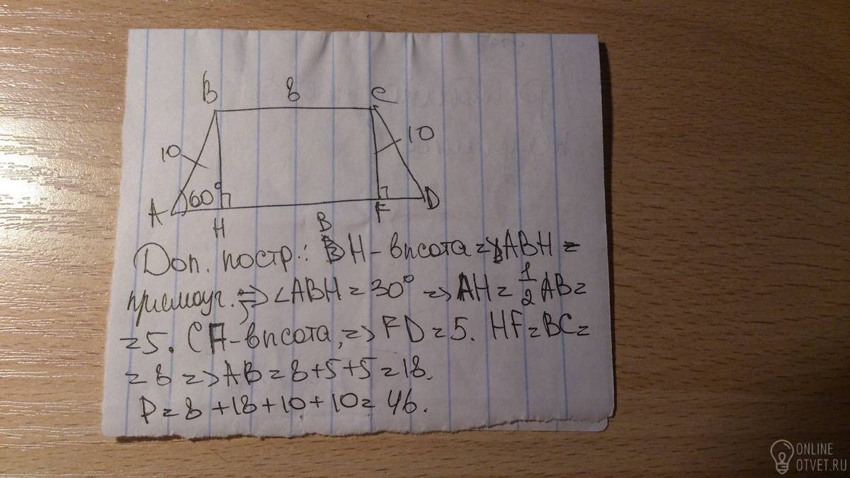 Меньшее основание равнобедренной трапеции равно 8 см боковая сторона 10 см а острый угол при основании 60 градусов. найдите периметр данной равнобедренной трапеции. ПОЖАЛУЙСТА С РИСУНКОМ И В ПОДРОБНОСТЯХ