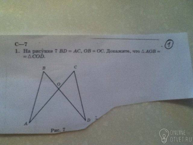 Из условия выходит, что и АО=ОД, так как от равных сторон отнять равные отрезки получаться другие равные отрезки. Угол АОВ = СОД, как вертикальные. Треугольники равны по ! признаку равенства , то есть сторона - угол - сторона. Понятно?
