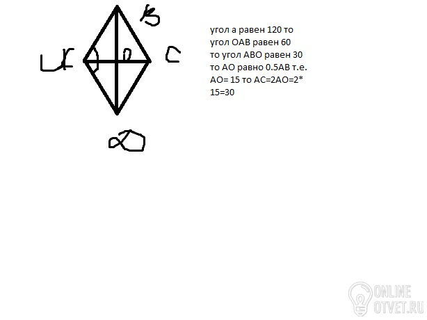 Сторона ромба равно 30,а тупой угол 120.найти длину меньшей диагонали ромба