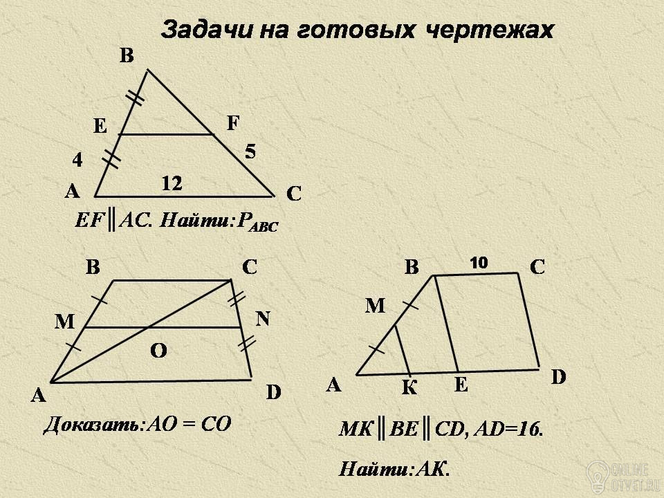 Помогите, пожалуйста, это надо решить по теореме Фалеса: если на одной из двух прямых отложить последовательно несколько равных отрезков и через их концы провести параллельные прямые, пересекающие вторую прямую, то они отсекут на второй прямой равные между собой отрезки.