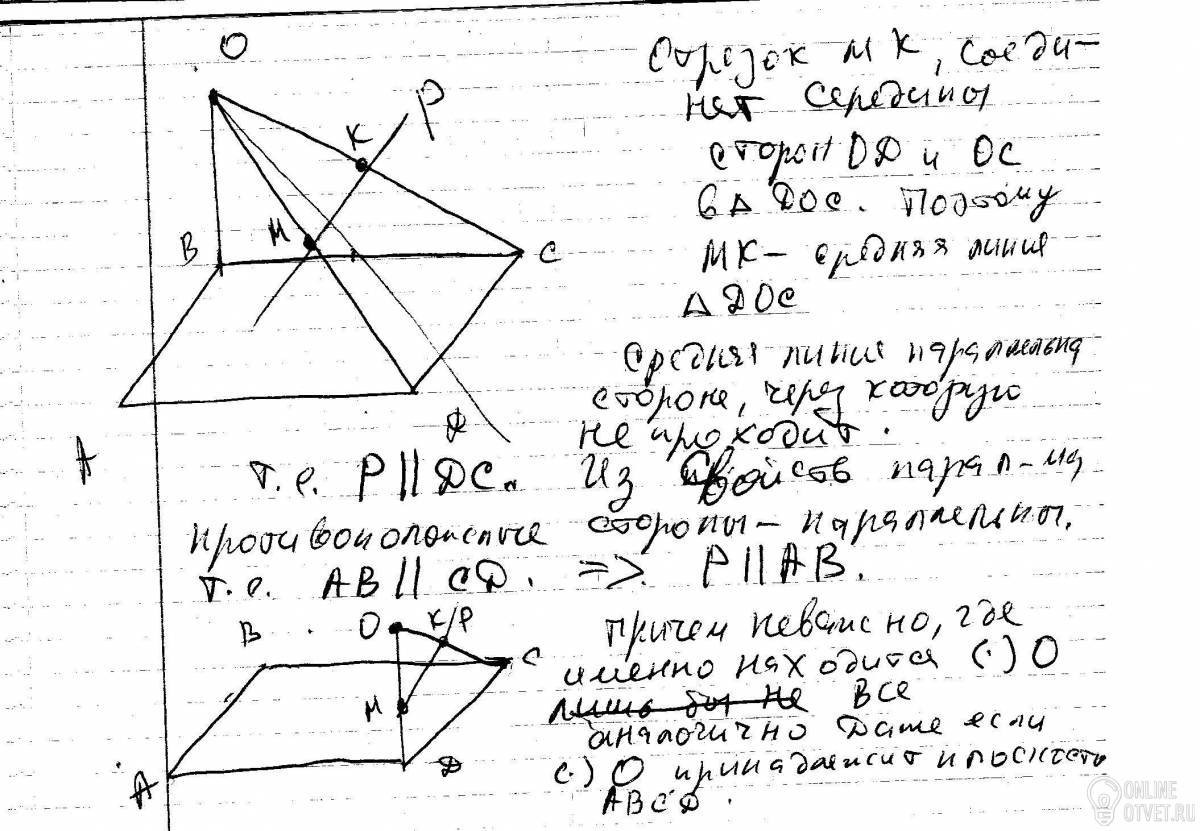 Тогда через середины ОС и ОD проходит только прямая р, и отрезок МК, соединяющий середины ОС и ОD, является средней линией треугольника DОC, параллелен DC, следовательно, параллелен и АВ по свойству двух прямых, параллельных третьей. Угол между скрещивающимися прямыми р и ВС также будет 50º. Но это уже другая задача.