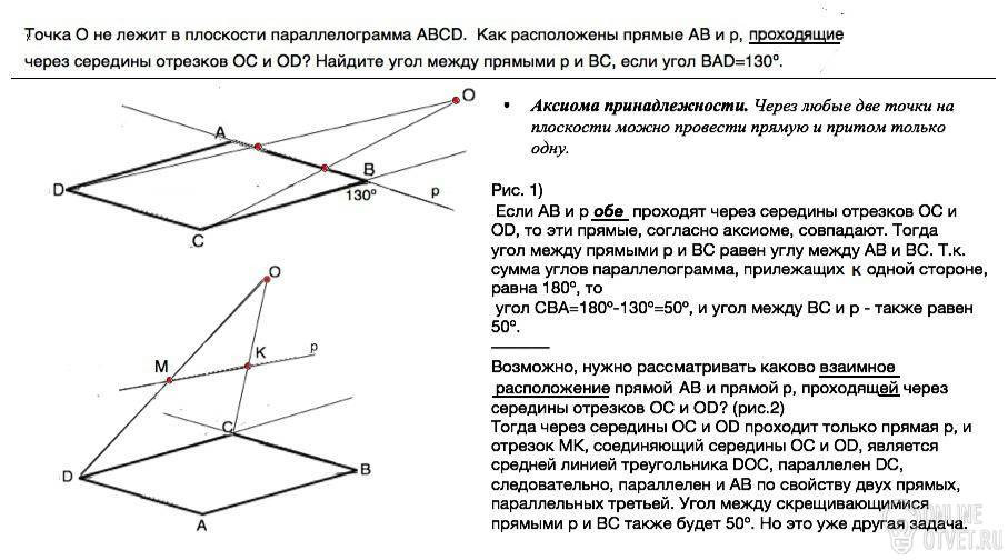 точка О не лежит в плоскости параллелограмма ABCD как расположены прямые AB и p,проходящие через середины отрезков OC и OD найдите угол между прямыми p и BC, если угол BAD=130
