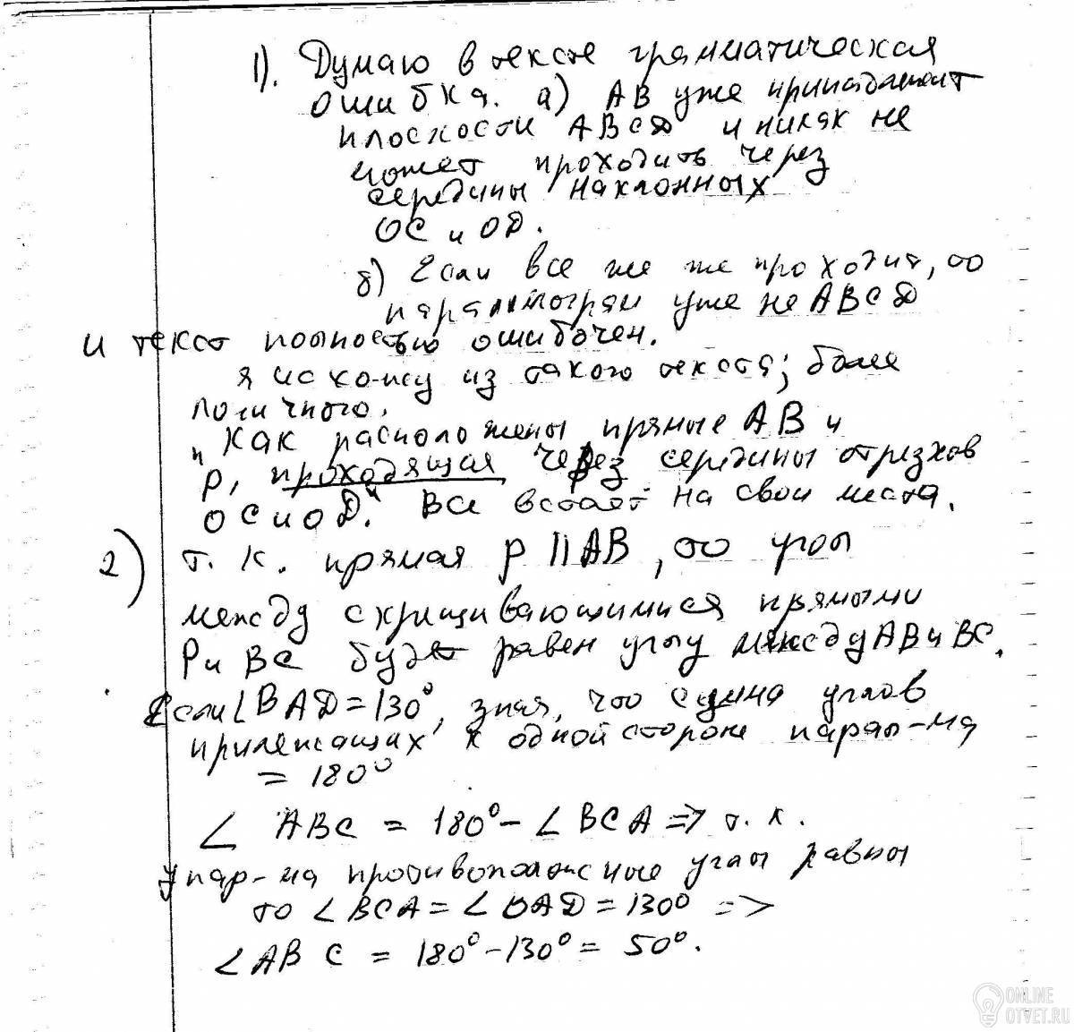 Аксиома . Через любые две точки на плоскости можно провести прямую и притом только одну.. Если АВ и робе проходят через середины отрезков ОС и ОD, то эти прямые, согласно аксиоме, совпадают. Тогда угол между прямыми р и ВС равен углу между АВ и ВС. Т.к. сумма углов параллелограмма, прилежащих одной стороне, равна 180º угол СВА=180º-130º=50º