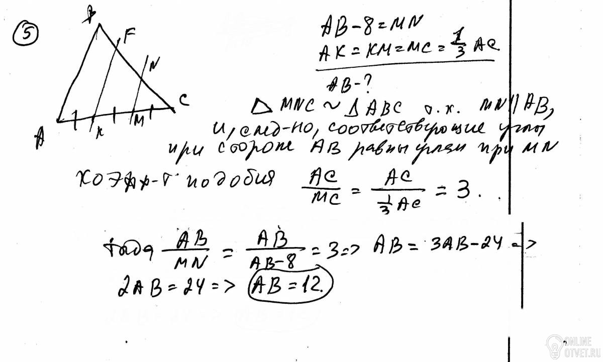 5. В треугольнике ABCD сторона AC разделена на три равных отрезка и через точки деления проведены прямые, параллельные стороне AB треугольника. Меньший из отрезков этих прямых, расположенных между сторонами треугольника, меньше стороны AB на 8 см. Найти сторону AB треугольника.