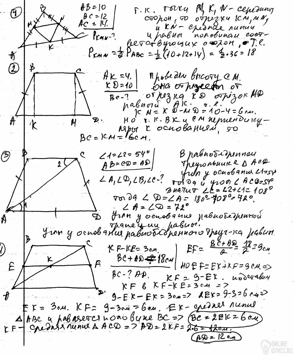 2. В равнобедренной трапеции АBCD высота BK делит основание AD на отрезки AK=4 см и KD=10 см. Найти основание BC трапеции.