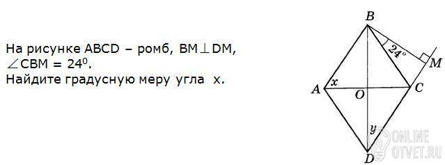 в ромбе все стороны равны, и диагонали пересекаются под прямым угом, значит треугBCD является равнобедренным, и СА является биссектрисой, поэтому уголDCA=угол ACB, но уголDCA, уголACB и уголВСМ составляют развернутый угол, значит в сумме дают 180, тогда уголАСВ=(180-66)/2=57