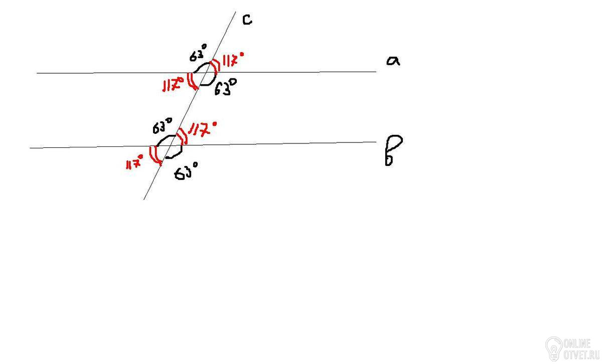 Один из углов, образованных при пересечении двух прямых, равен 63*. найти градусные меры всех остальных углов