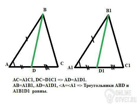 В треугольниках АВС и А1 В1 С1, АВ=А1В1, АС= А1 С1, угол А равен