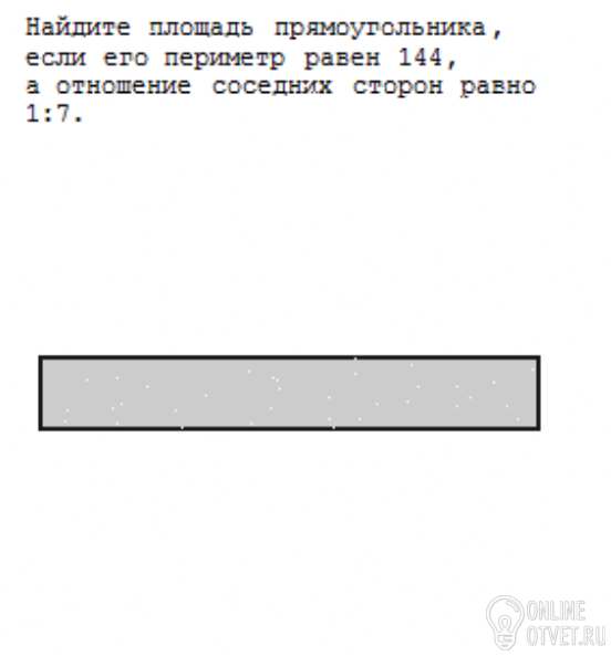 Пусть одна часть будет Х. значит одна сторона х, а другая 7х. периметр равен 2(х+7х)=144, 16х=144, х=9. значит одна сторона 9, а другая 9*7=63. площадь равна 9*63=567. все)