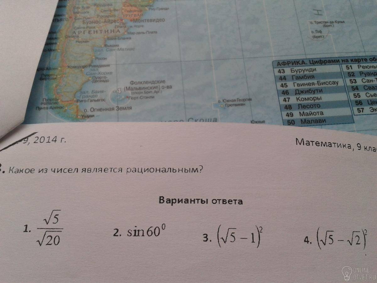 1.корень из 5/на корень из 20= корень из 1/4=1/2 - рациональное 2. sin60= корень из 3/2 - нет 3. в квадрате разности содержится 2 корня из 5 -нет. 4. и здесь в квадр. разности содержится 2 корня из 10 -нет.