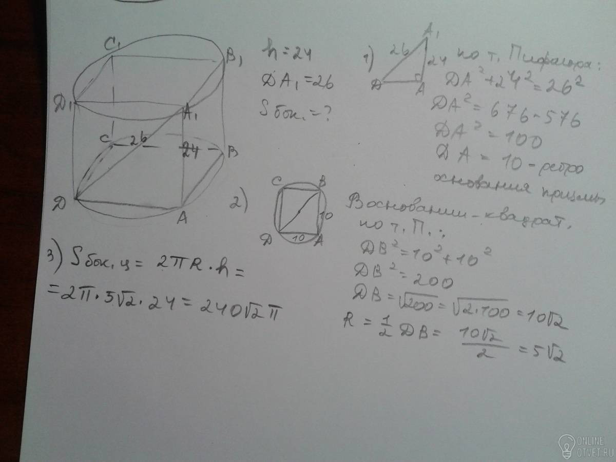Вокруг правильной четырехугольной призмы описан цилиндр.Найдите площадь его боковой поверхности,если высота призмы равна 24 а диагональ боковой грани 26 .решение ?????