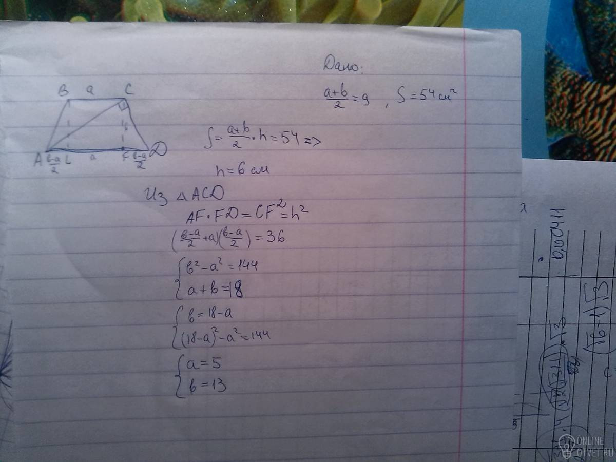 дана равнобедренная трапеция, средняя линия которой = 9 см. площадь трапеции 54 см^2. диагонали перпендикулярны боковой стороне, определите основания трапеции