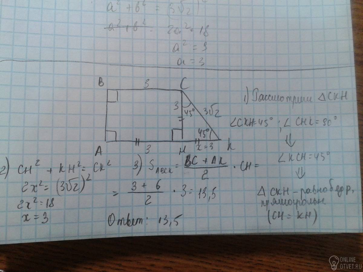 В прямоугольной трапеции АВСК боковая сторона равна три корень и двух, угол К равен 45 градусов, высота СН делит основание АК пополам.Найдите площадь трапеции
