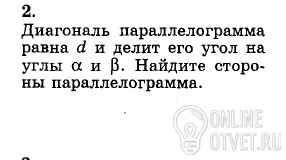 Параллелограмм АВСД, АС=d, уголВАС=b, уголСАД=a=уголАСВ как внутренние разносторонние, уголВ=180-(а+b), AC/sin(180-(а+b))=BC/sinb, d/sin(a+b)=BC/sinb, BC=АД=d*sinb/sin(a+b), AC/sin(180-(а+b))=AB/sina, d/sin(a+b)=AB/sina, АВ=СД=d*sin а/sin(a+b)