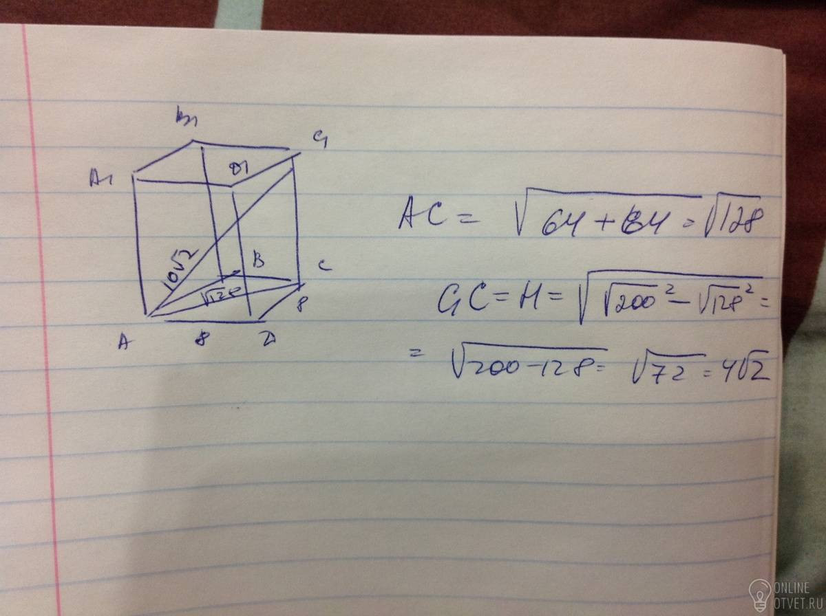 В основании прямоугольного параллелепипеда ABCDA1B1C1D1 лежит квадрат ABCD, длина стороны которого равна 8 см. Найдите длину бокового ребра параллелепипеда если длина его диагоналей равна 10√ 2 см