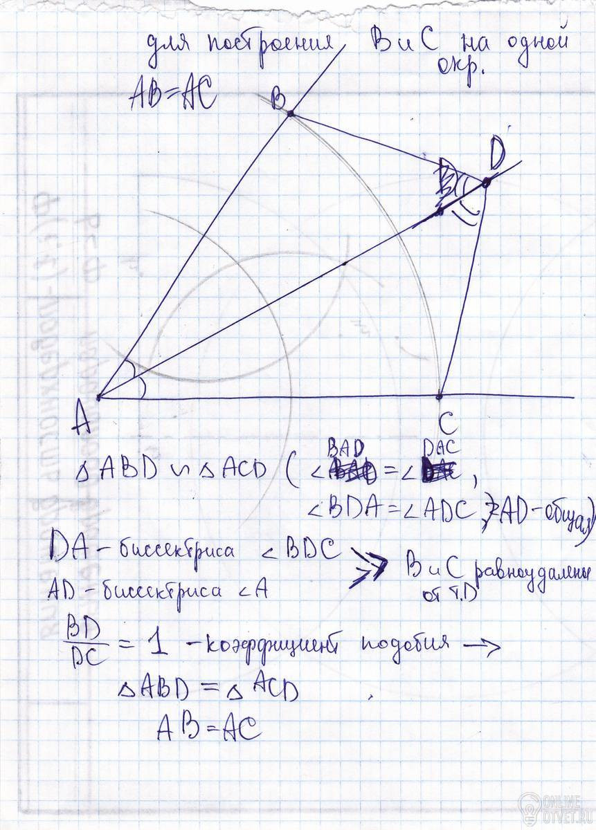 Луч AD-биссектриса угла A. На сторонах угла A отмечены точки B и C так, что угол ADB=углу ADC. Докожите, что AB=AC