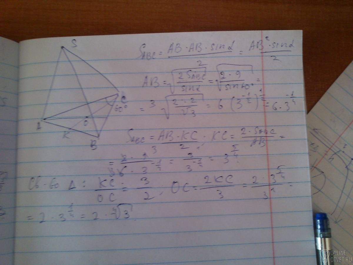 В правильной треугольной пирамиде SABC медианы основания ABC пересекаются в точке O. Площадь треугольника ABC равна 9; объем пирамиды равен 6. Найдите длину отрезка OC .