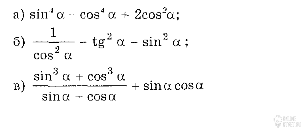 1.sin^4α-cos^4α=(sin^2α-cos^2α)(sin^2α+cos^2α)=sin^2α-cos^2α т.к. во второй скобке основное тригонометрическое тождество=1.