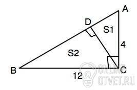 В прямоугольном треугольнике ABC угол C=90градусов, CD-высота треугольника, AC=4см , CB=12см. Чему равно отношение площадей треугольников ACD и CDB ?