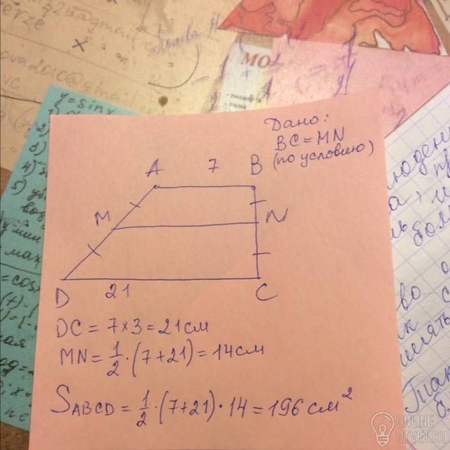 Основание трапеции равно 7, другое-в 3 раза больше. Высота трапеции равно ее средней линии. Найдите площадь трапеции.