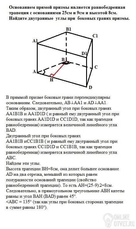 при боковых гранях СС1D1D и CC1В1В, так как трапеция равнобедренная) измеряется величиной линейного угла AВС.