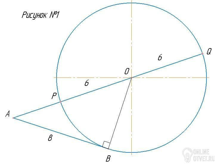 Дана окружность радиуса 6 с центром в точке O. Через точку A, расположенную вне окружности, и точку O проведена прямая, пересекающая окружность в точках P и Q. Найдите длину AQ, если известно, что длина касательной AB, проведённой к данной окружности, равна 8