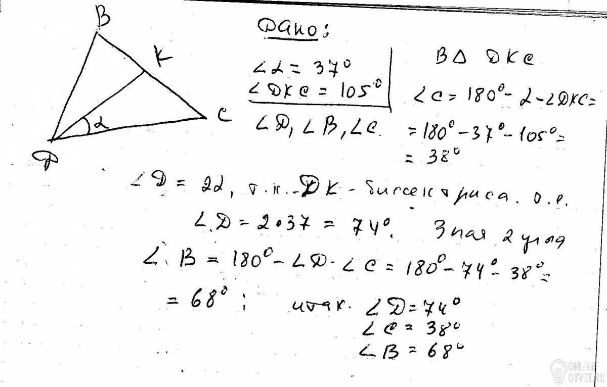 В треугольнике DBC проведена биссектриса DK.оПРЕДЕЛИТЕ УГЛЫ ТРЕУГОЛЬНИКА dbc, ЕСЛИ УГОЛ CDK=37(градусов),угол DKC=105(градусов).помогите срочно...зарание спасибо)