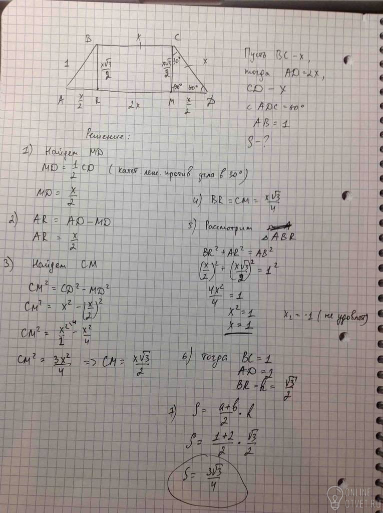 60°, сторонаAB равна1. Найдите площадь трапеции