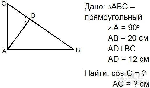 Треугольник АВС, уголА=90, АД высота=12, АВ=20, треугольник АДВ прямоугольный, ВД=корень(АВ в квадрате-АД в квадрате)=корень(400-144)=16, АД в квадрате=ВД*СД, 144=16*СД, СД=144/16=9, ВС=9+16=25, АС в квадрате=СД*ВС=9*25=225, АС=15, cosC=АС/ВС=15/25=3/5=0,6