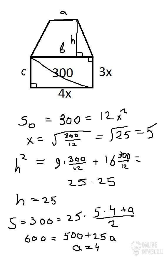 Площадь трапеции равна 300 см.Ее большее основание является большей стороной прямоугольника, площадь которого также равна 300 см. Известно, что стороны прямоугольника относятся как 4:3. При этом высота трапеции равна диагонали данного прямоугольника. Найдите меньшее основание трапеции ( в см).