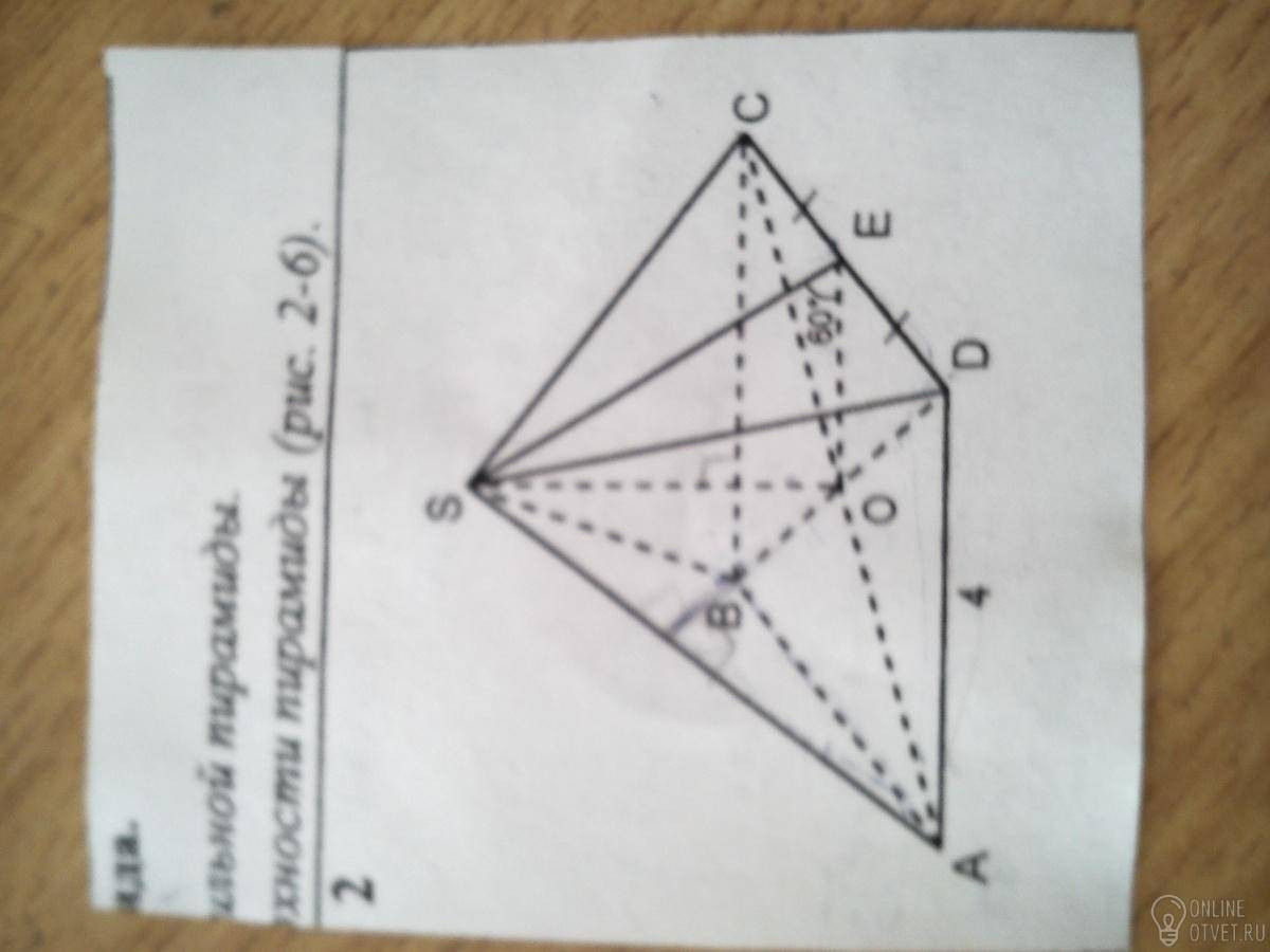 Пирамида SАВСД, в основании квадрат-АВСД, АВ=ВС=СД=АД=4, треугольник SОЕ прямоугольный угол SЕО=60, угол ЕSО=90-60=30, О-центр пирамиды, ОЕ=1/2АД=4/2=2, SЕ-апофема=2*ОЕ=2*2=4, полная поверхность пирамиды=площадьАВСД+площадь боковой поверхности, площадь АВСД=АВ*АД=4*4=16, площадь боковой=1/2периметрАВСД*апофема( SЕ)=1/2*(4*4)*4=32, полная поверхность=16+32=48