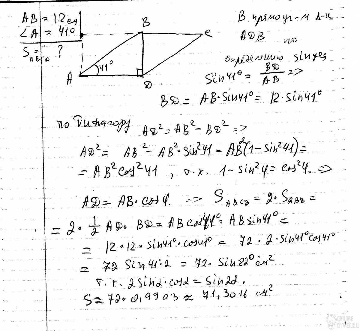 Диагональ ВД параллелограмма ABCД перпендикулярна к стороне АД. Найдите площадь параллелограмма АВСД, если АВ=12 см, угол=41°