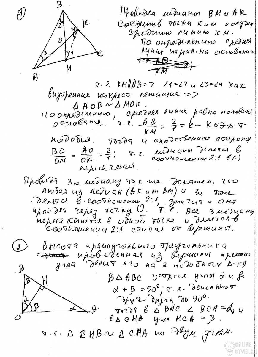 1. Докажите, что медианы треугольника пересекаются в одной точке, которая делит каждую медиану в отношении 2:1 , считая от вершины
