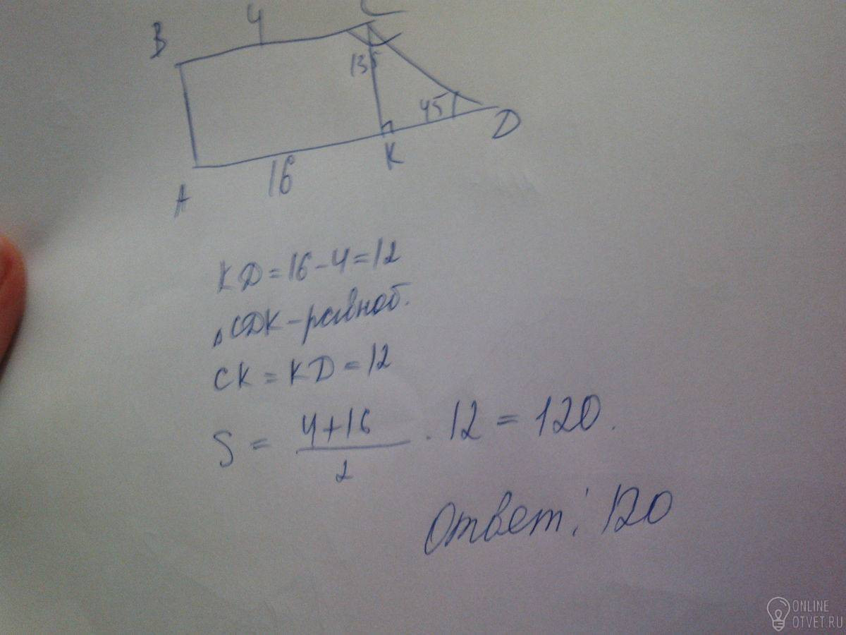 Найдите площадь прямоугольника трапеции ,если ее основания равны 4см и 16 см,а один из углов 135градусов