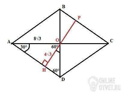 Диагонали ромба взаимно перпендикулярны, являются биссектрисами углов и точкой пересечения делятся пополам. Следовательно, отрезок ОD или AO равен 8√3.