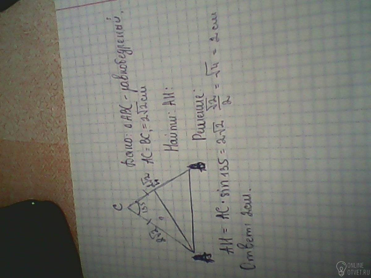 В треугольнике ABC AC=BC=2 корень из 2, угол C равен 135 градусов. Найдите высоту AH.