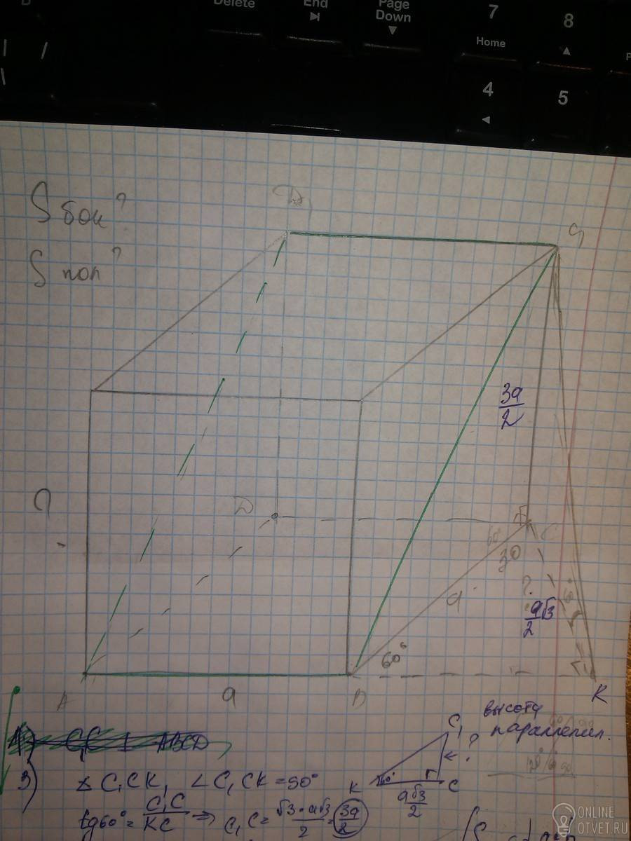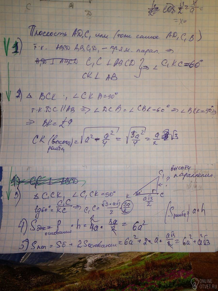 Основанием прямого параллелепипеда ABCDA1B1C1D1 является ромб АВСD, сторона которого равна а и угол равен 60 градусов. Плоскость AD1C1 составляет с плоскостью основания угол равен 60 градусов. Найдите: