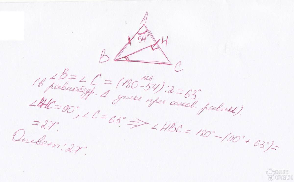 Помогите решить к завтрашнему дню пожалуйста:(.В равнобедренном треугольнике АВС с основанием ВС угол А=54градусов.Найдите угол НВС,где ВН-высота треугольника.