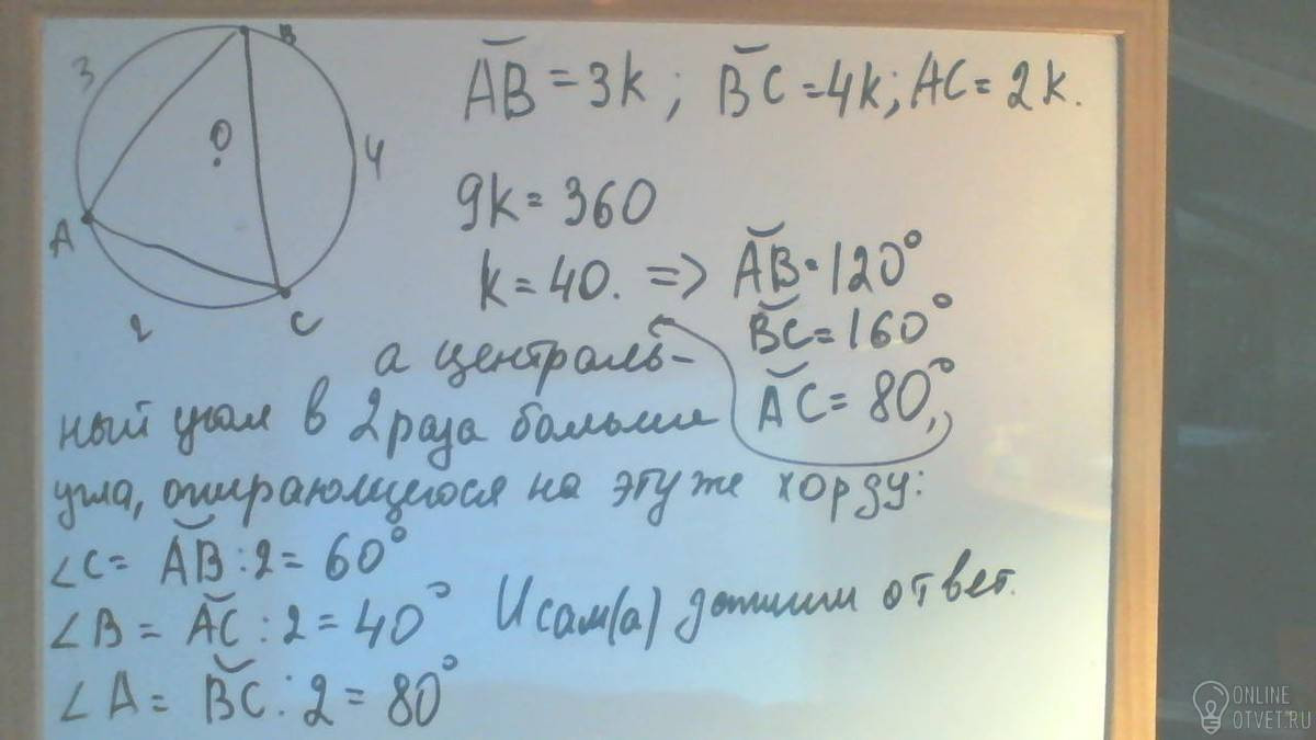 Окружность разделена тремя точками на дуги длины которых относятся как числа 2,3,4 иточки деления соединены отрезками Вычислите углы полученного треугольника