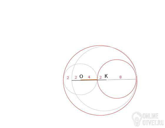 2 окружности с центрами в О и К имеют соответственные радиусы 4 и 8 см. Найдите радиусы окружностей, касающихся одновременно двух данных если их центры лежат на прямой ОК и отрезок ОК равен 6 см