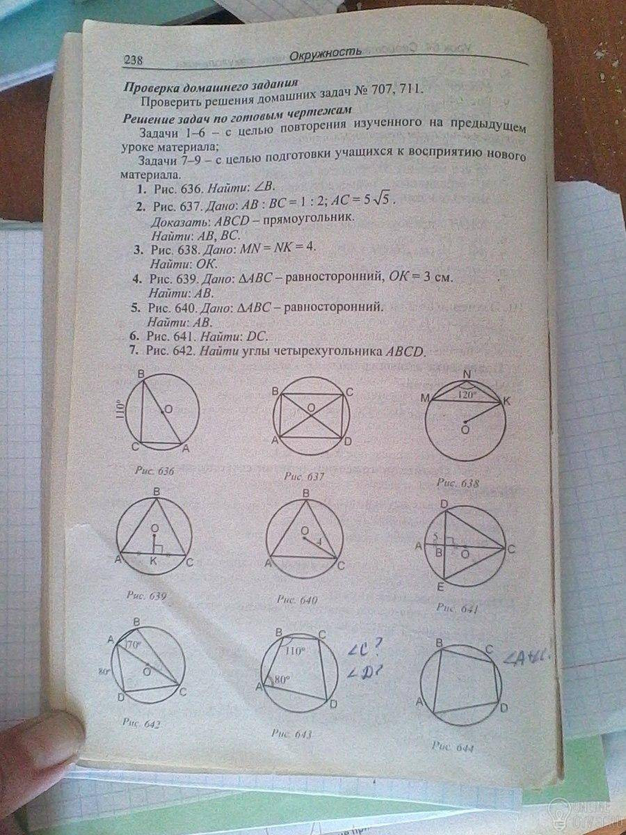 7.уголД=В=90 (опираются на диаметр), С=75, А=105