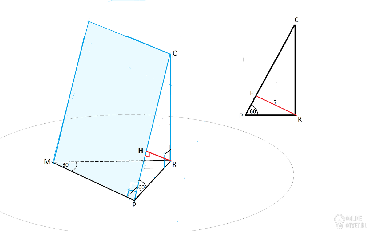 В треугольнике MKP MK = 12 см, угол М = 30, угол Р = 90. Плоскость а проходит через сторону MP и образует с плоскостью MKP 60 градусов. Найдите расстояние от точки К до плоскости а.РИСУНОК