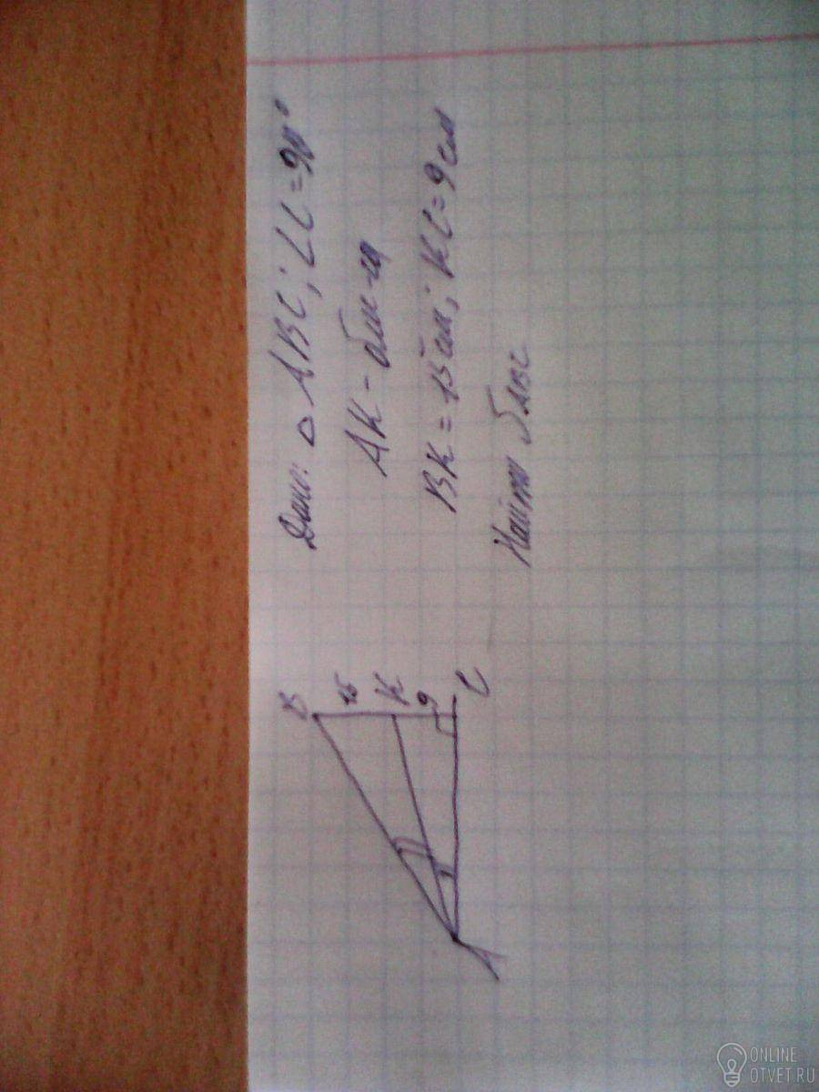 Треугольник АВС, уголС=90, АК-биссектиса, ВК=15, КС=9, ВС=15+9=24, АС=х, АВ в квадрате=ВС в квадрате+АС в квадрате=576+х в квадрате, ВК/КС=АВ/АС, 15/9=корень(576+х в квадрате)/х, обе части в квадрат, 225/81=(576+х в квадрате)/х в квадрате, 225*х в квадрате=46656+81*х в квадрате, х=18=АС, площадьАВС=1/2АС*ВС=1/2*18*24=216