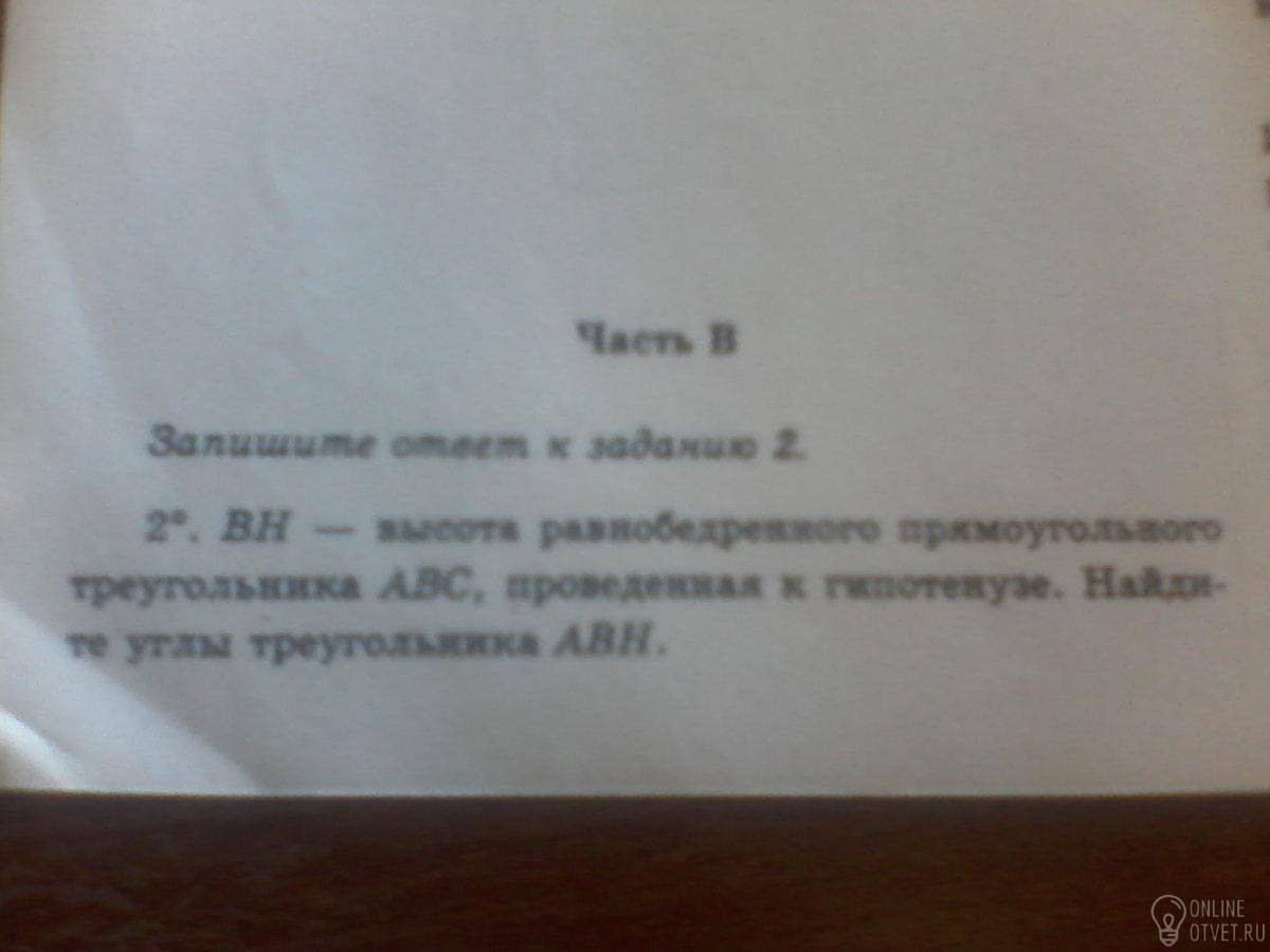 Ответ: угол АВН= 45 градусов, угол А= 45 градусов, угол АНВ= 90 градусов.