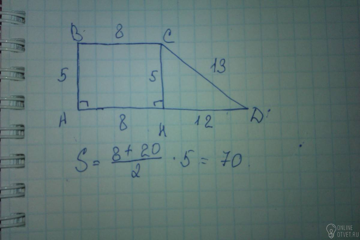 Найдите площадь трапеции АВСД с основаниями если ВС перпендикулярно АВ,АВ= 5см,ВС=8см,СД=13см