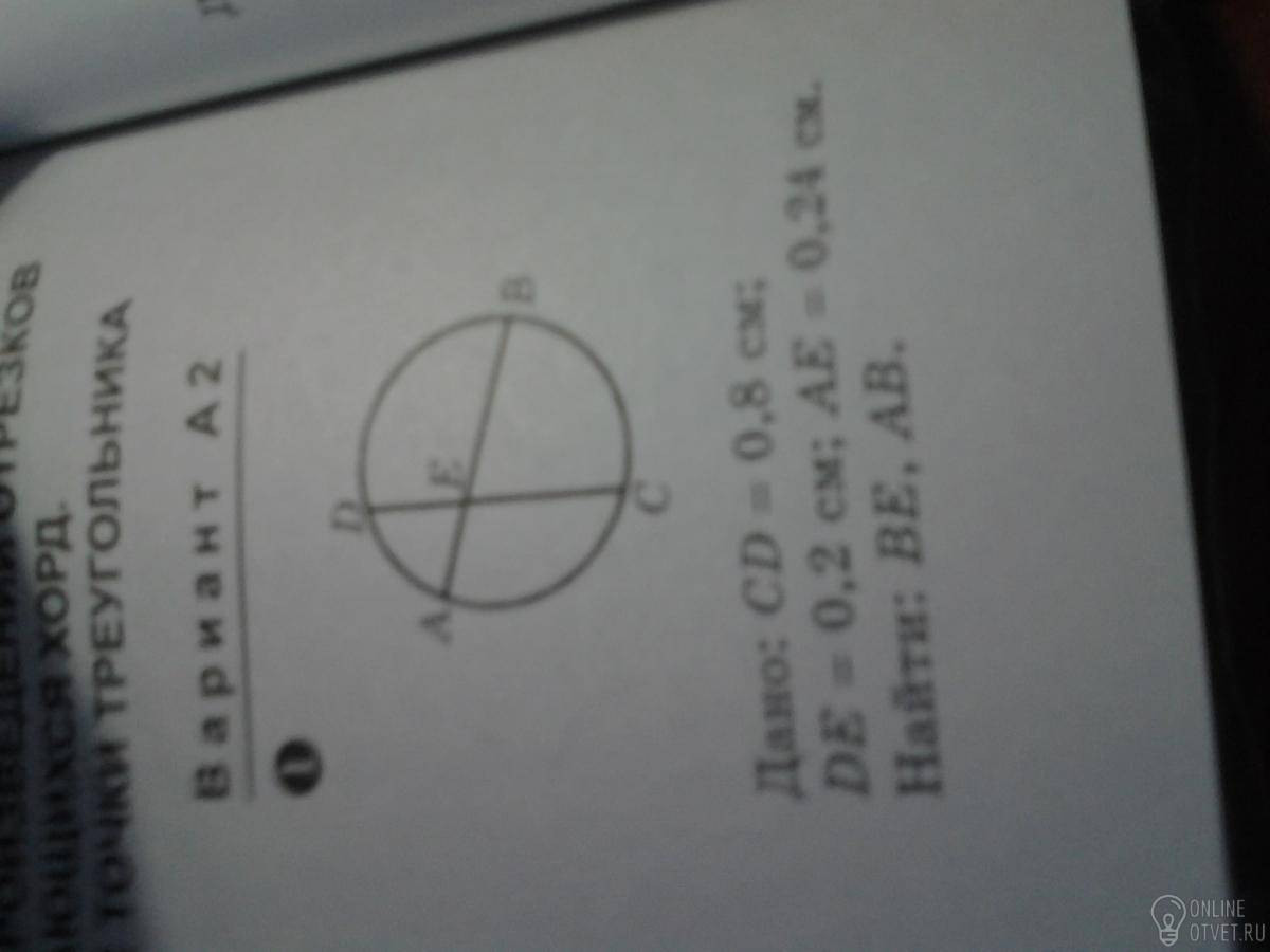 СЕ=СД-ДЕ=0,8-0,2=0,6, ДЕ*СЕ=АЕ*ВЕ, 0,2*0,6=0,24*ВЕ, ВЕ=0,12/0,24=0,5, АВ=АЕ+ВЕ=0,24+0,5=0,74