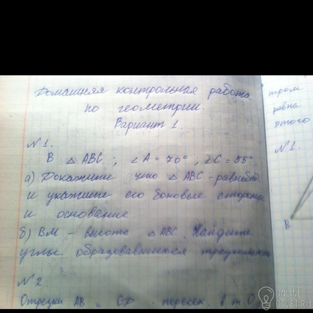 Угол б = 180 - угол а - угол с = 180 - 70 -55= 55Так как угол а = угол с = 55, то треугольник равнобедренный с основанием АСвысота является также и биссектрисой, так как это равнобедренный трегольникона делит уггол б на два угла, которые равны по 35 градусов (70/2=35) Треугольники равны по перому признаку равенства треугольникоа (АО=БО, СО=ОД, а угол АОС = угол БОД как вертикальные)угол АСО = угол ОБД = 115 градусов, угол БОД равен 180 - 115 - 20 = 45угол БОД = угол АОС = 45 пусть боковая сторона равна х, тогда сумма двух боковых сторор равна 2х. составим уравнение2х +16 = 642х = 48х = 24