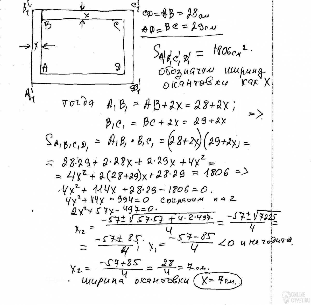 Картинка имеет форму прямоугольника со сторонами 28 см и 29 см.Её наклеили на белую бумагу так,что вокруг картинки получилась белая окантовка одинаковой ширины. Площадь,которую занимает картинка с окантовкой, равна 1806 см(2). Какова ширина окантовки?
