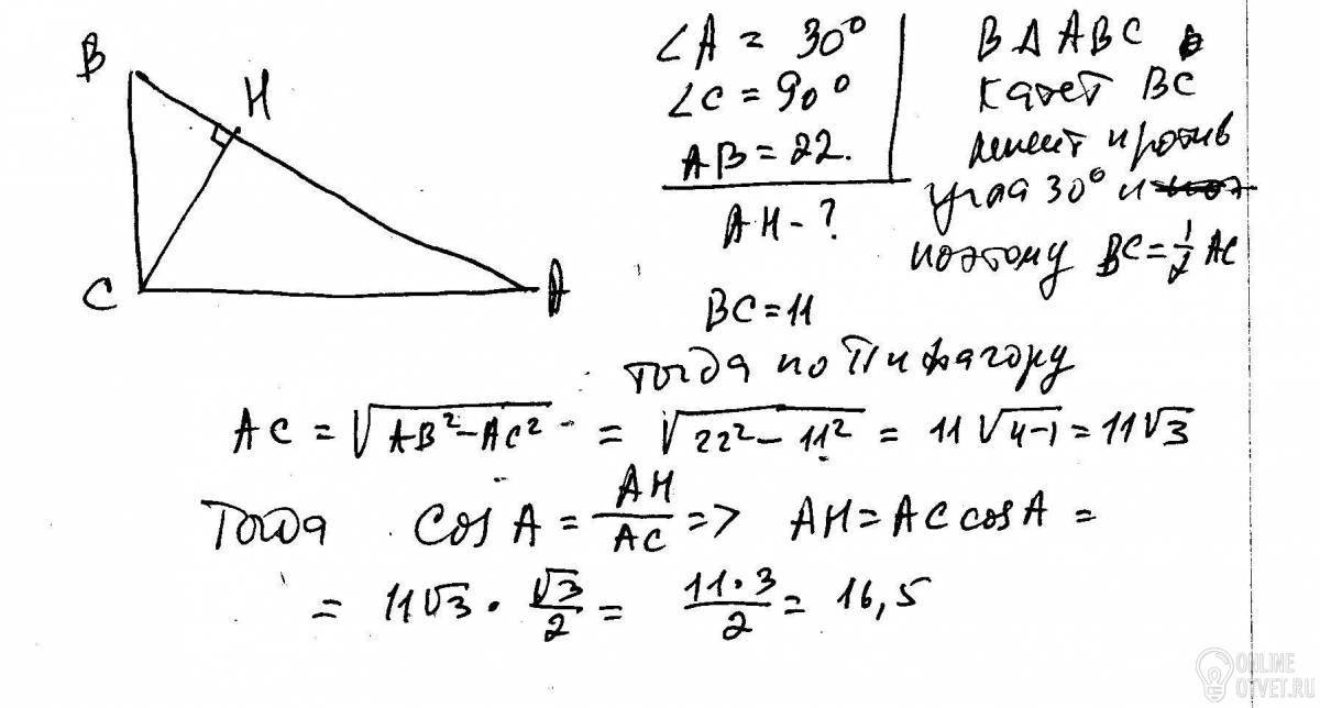 В треугольнике АВС угол С равен 90 градусов ;СН высота , угол А равен 30 градусам,АВ=22.Найти АН.